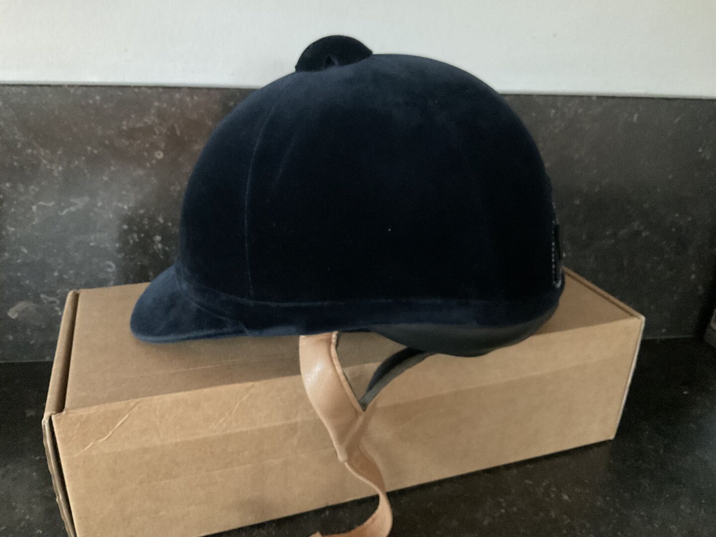 Czapka jeździecka Charles Owen - Czapka jeździecka Charles Owen, ciemnoniebieska, damska, rozmiar 59, / 7 1/4, z dżetami / kokardą, napisem, noszona raz, właściwie nowa