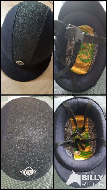Czapka jeździecka rozmiar 59 - Czarny czaprak jeździecki rozmiar 59, stan bardzo dobry, bezwypadkowy, z brokatowymi paskami