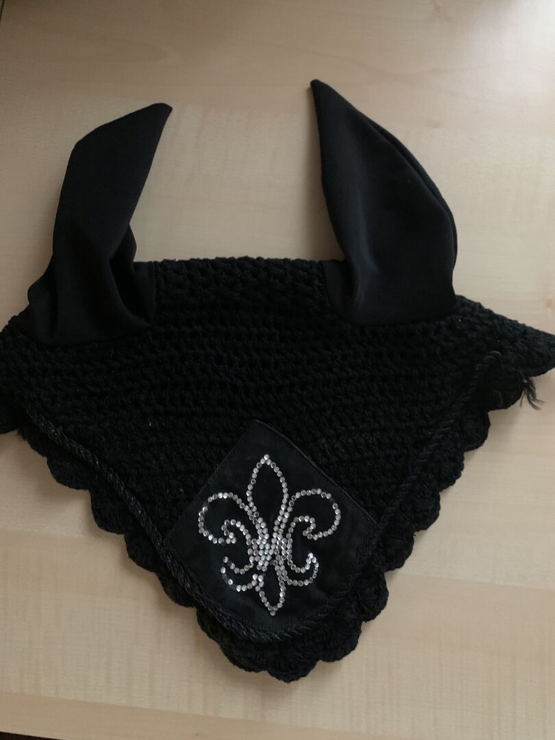 Czapka na muchy / uszy muchy czarne z kucykiem z dżetów - Raz użyta czapka na muchy w kolorze czarnym z aplikacją z dżetów. Rozciągliwy, lekki materiał przy uszach.