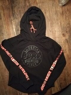 Czarna bluza z kapturem - Czarna bluza z kapturem z nadrukiem w tonacji z przodu i pomarańczowymi napisami na rękawach Rozmiar dziewczęcy M (odpowiadający rozmiarowi 146/152) Mało noszone, stan bardzo dobry, prawie jak nowe