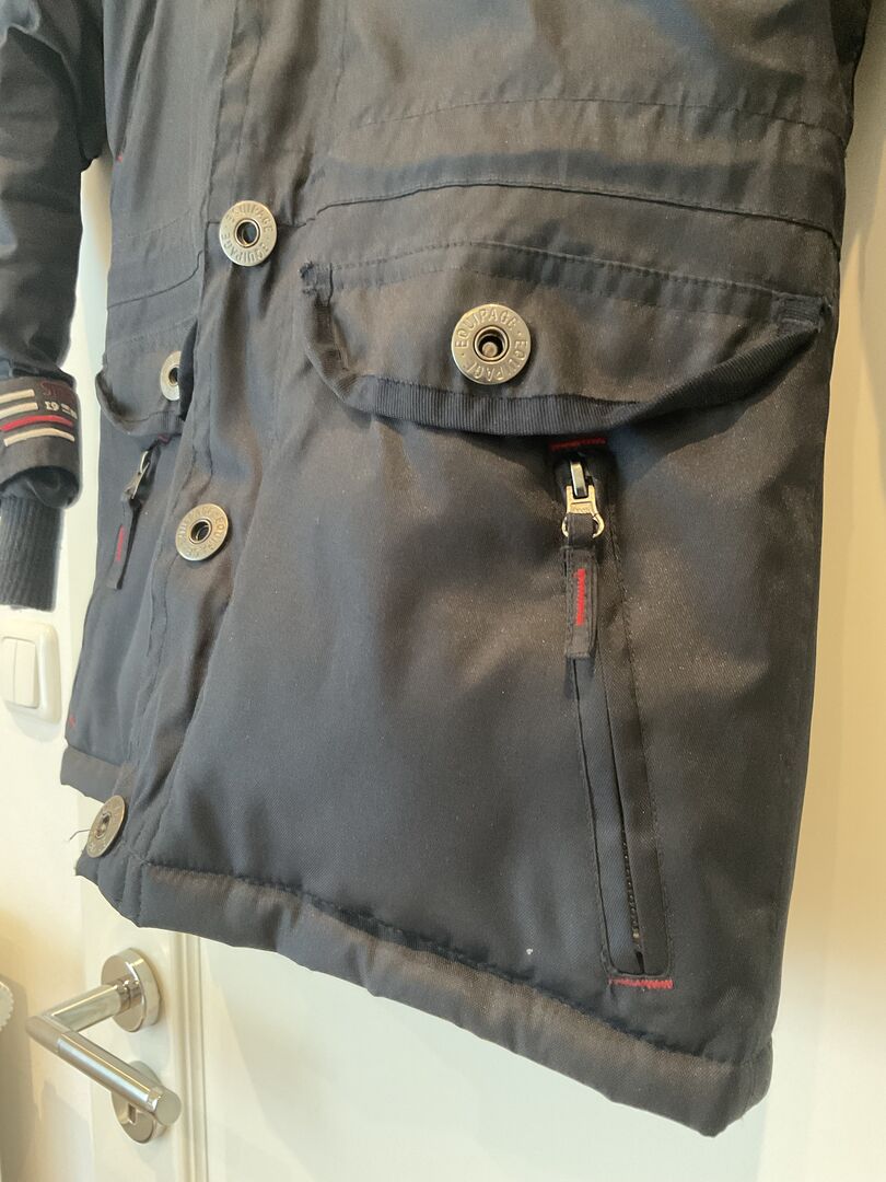 Czarna kurtka zimowa Equipage rozmiar 140 - - rozmiar 140 - Wiele kieszeni, w tym kieszeń wewnętrzna - kaptur jest odpinany i, podobnie jak kieszenie, podszyty przyjemnie miękkim materiałem - wodoodporna i wiatroszczelna - szew jednej z kieszeni niestety się rozpiął (patrz zdjęcia), ale w razie wątpliwości można go bardzo łatwo przyszyć - w jednym z dwóch zamków błyskawicznych brakuje części (patrz zdjęcie), ale zamek może być używany bez żadnych problemów - poza tym bez wad - sprzedaż prywatna, więc bez gwarancji - w razie pytań/zainteresowania proszę o kontakt :)