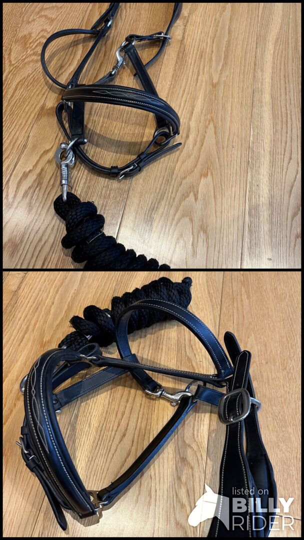 Czarna skórzana uzda z linką - dobry stan - Czarna skórzana uzda z wyściełanym noskiem i srebrnymi okuciami. Zawiera czarną linkę z klipsem. Czysty i zadbany, tylko lekko używany. Brak uszkodzeń i wszystkie sprzączki działają dobrze.