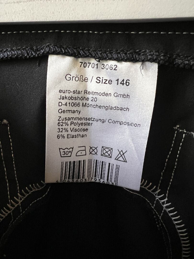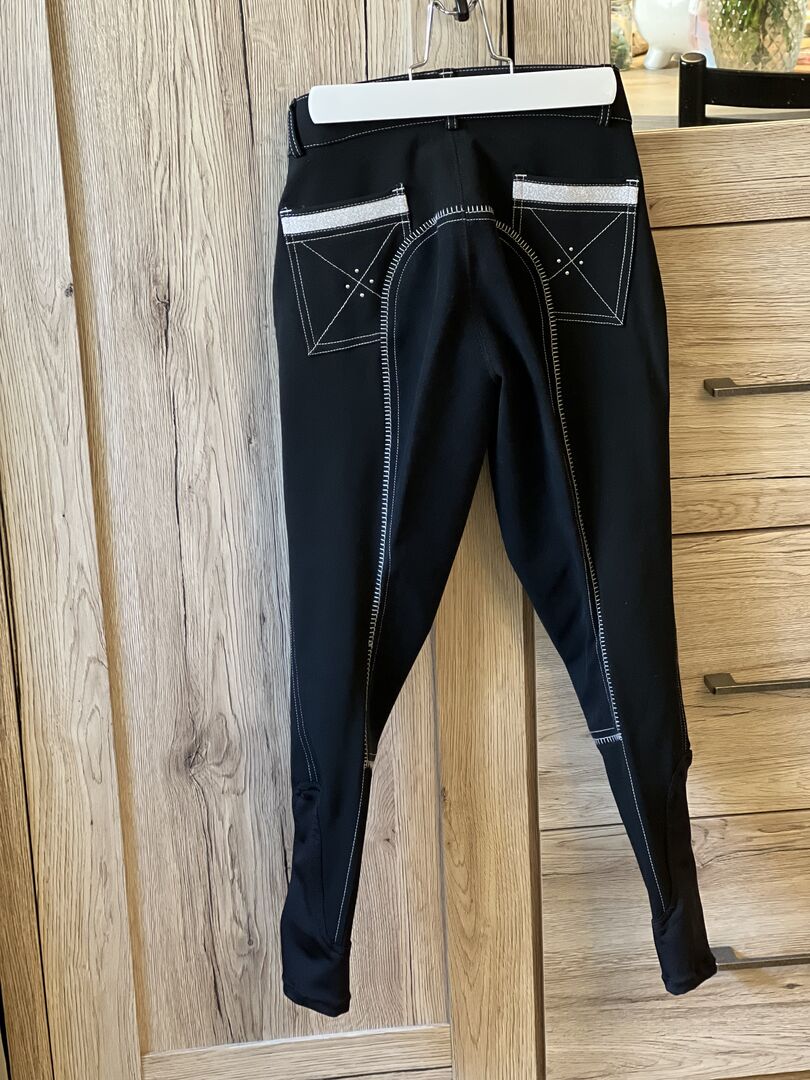 Czarne bryczesy jeździeckie z pełnym skórzanym siedziskiem - Sprzedaję parę czarnych bryczesów jeździeckich. Mają pełne skórzane wykończenie i brokat na kieszeniach. Bryczesy są nowe i nigdy nie były noszone. Mają rozmiar 146 cm.
