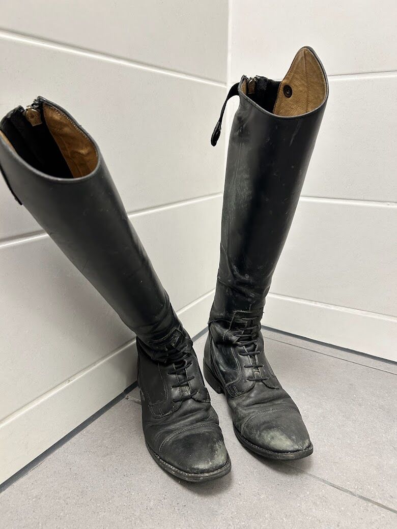 Czarne skórzane buty do jazdy konnej - Czarne skórzane buty jeździeckie z normalnymi śladami zużycia na sprzedaż, zamek błyskawiczny w dobrym stanie, szerokość cholewki 30 cm