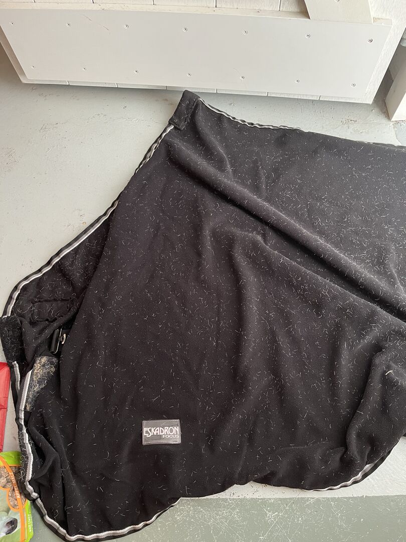 Czarny dywanik jeździecki - Czarny dywanik Eskadron 145 jest jeszcze w dobrym stanie, ale ma na sobie włosy pleśni, które wciąż trzeba usunąć.