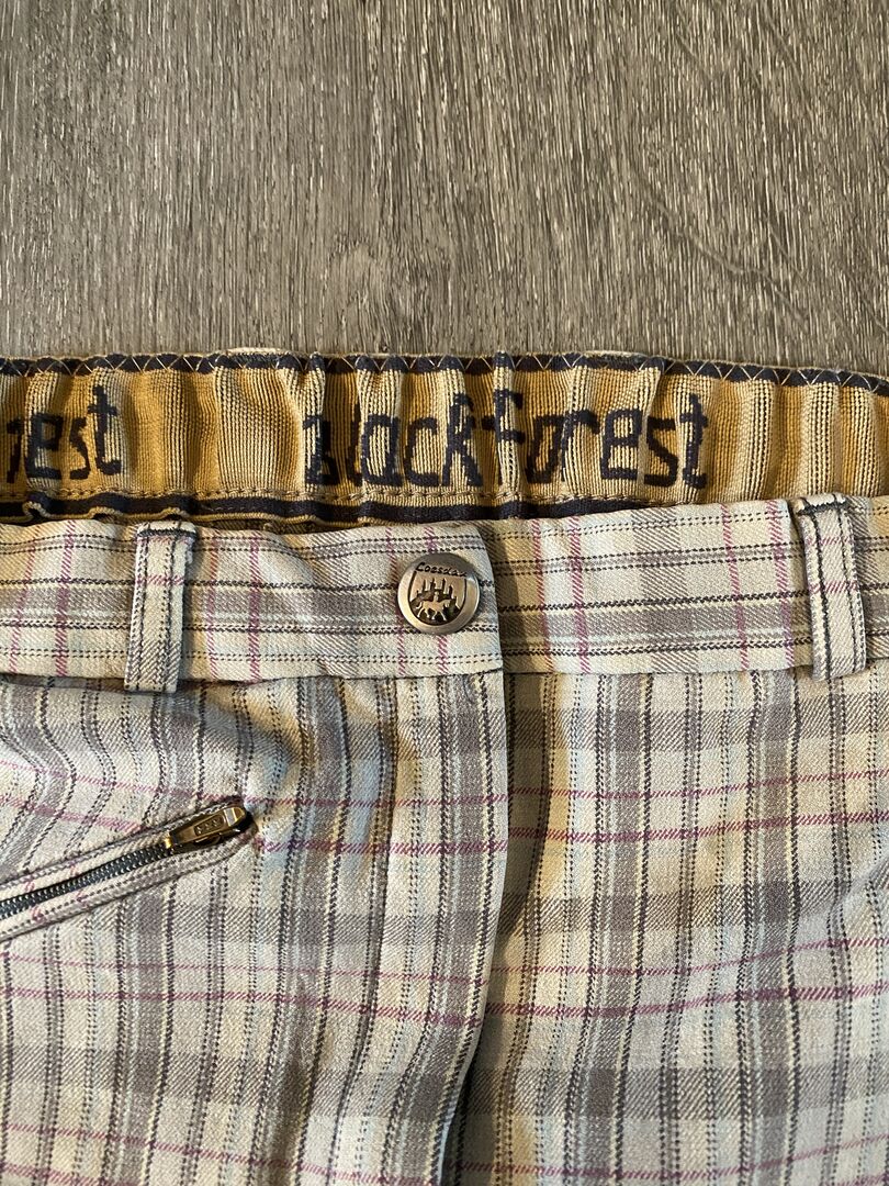 Czarny Las bryczesy kratka 36/38 - Sprzedam parę używanych, ale w dobrym stanie bryczesów firmy Black Forest. Według nadruku mają rozmiar 36, ale można je też nosić idealnie z 38. Mają ładny wzór w kratkę. Niestety mam za dużo bryczesów, więc z przyjemnością zdejmuję je ponownie. Bryczesy posiadają zamszowe skórzane pełne siedzenie w kolorze jasnoszarym. Posiadają zapięcie na rzep na nogawce.