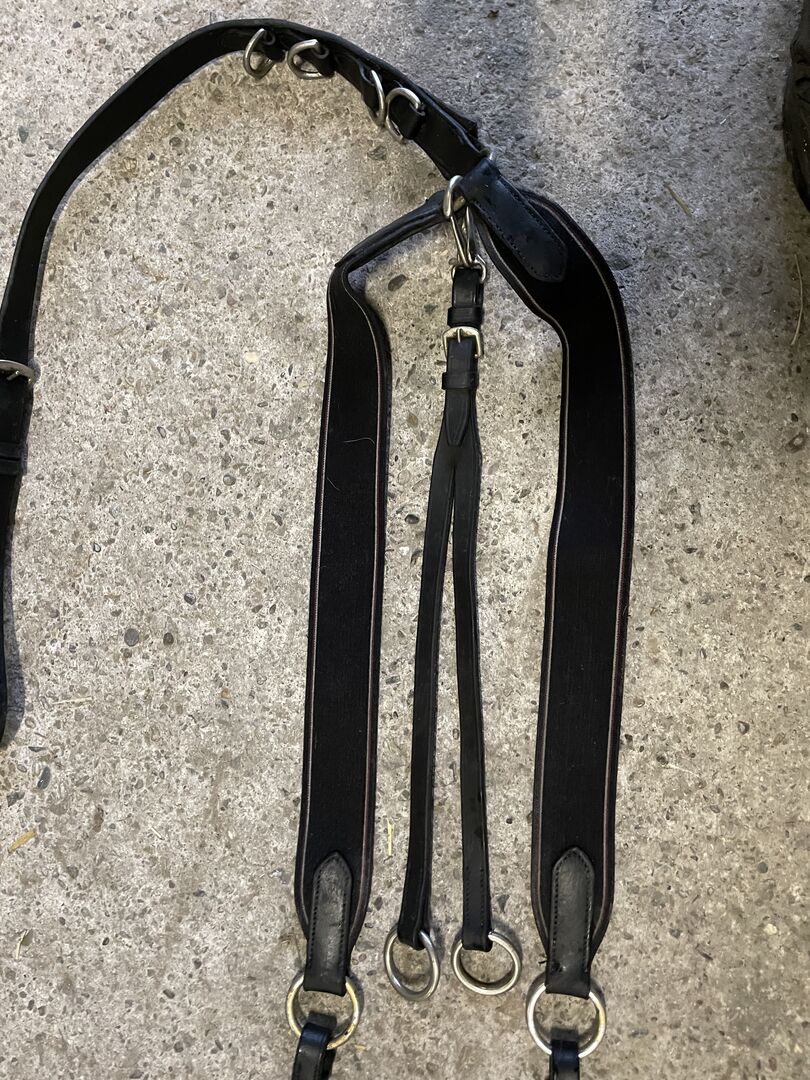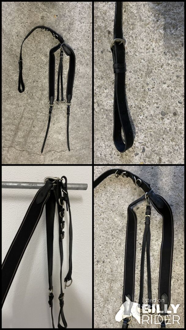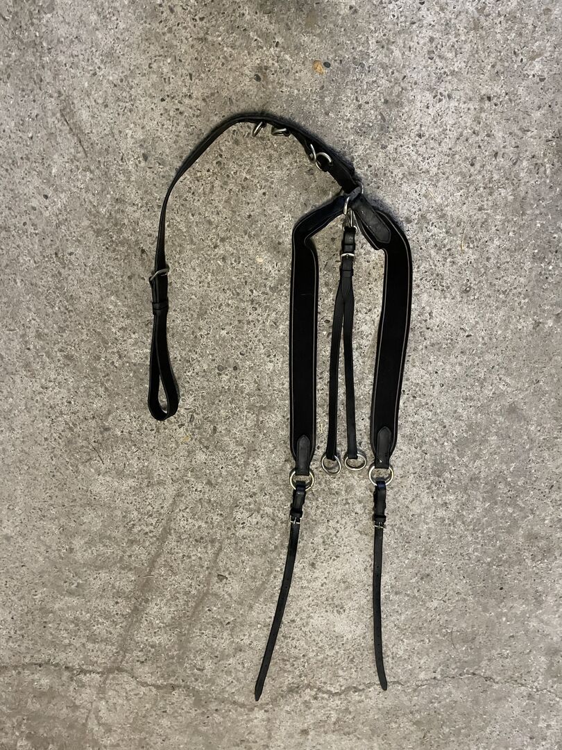 Czarny napierśnik - W ofercie piękny napierśnik z martingalem w rozmiarze wb w kolorze czarnym. Na gumowej wkładce znajdują się różowe i białe linie. Bez karabinka. Odbarwienia widoczne na zdjęciach. Napierśnik można obejrzeć i odebrać po uzgodnieniu w 79802 Dettighofen lub w okolicach Tuttlingen lub Villingen-Schwenningen. Wysyłka za dodatkową opłatą.