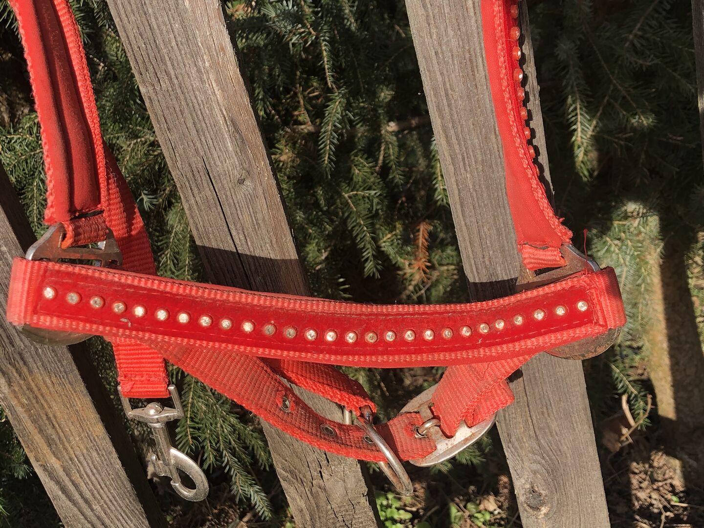 Czerwony kucyk w rozmiarze halter - Sprzedam czerwoną halterkę firmy Waldhausen w rozmiarze pony. Błyszczące kamienie na nosku i opasce na policzki.