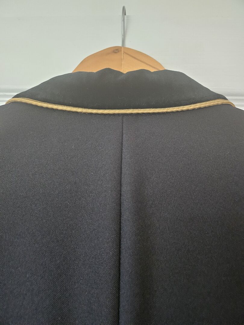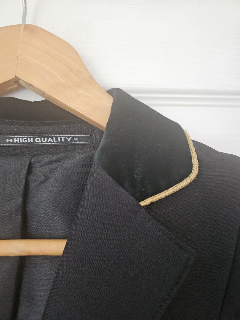 A lovely stylish jacket with gold trimmed velvet collar and gold logo buttons. Very elegant look. Well cared for and in excellent condition.