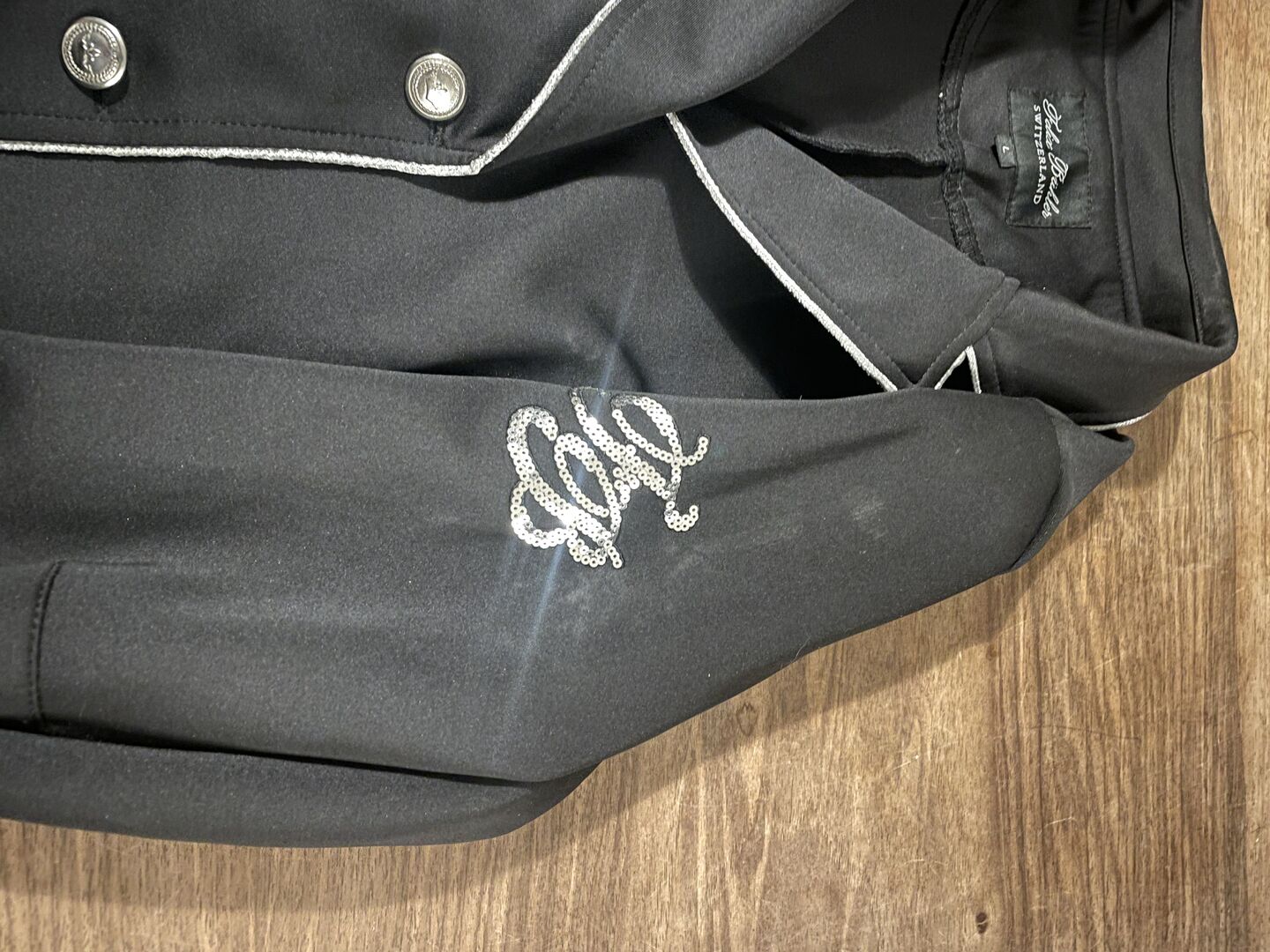 Damska kurtka zawodnicza - Rozmiar L, 2x noszony, czarny, jak nowy, z brokatowymi cekinami na lewym ramieniu, srebrna lamówka z przodu, srebrne guziki, 2 boczne kieszenie na zamek, bardzo wygodny elastyczny materiał.