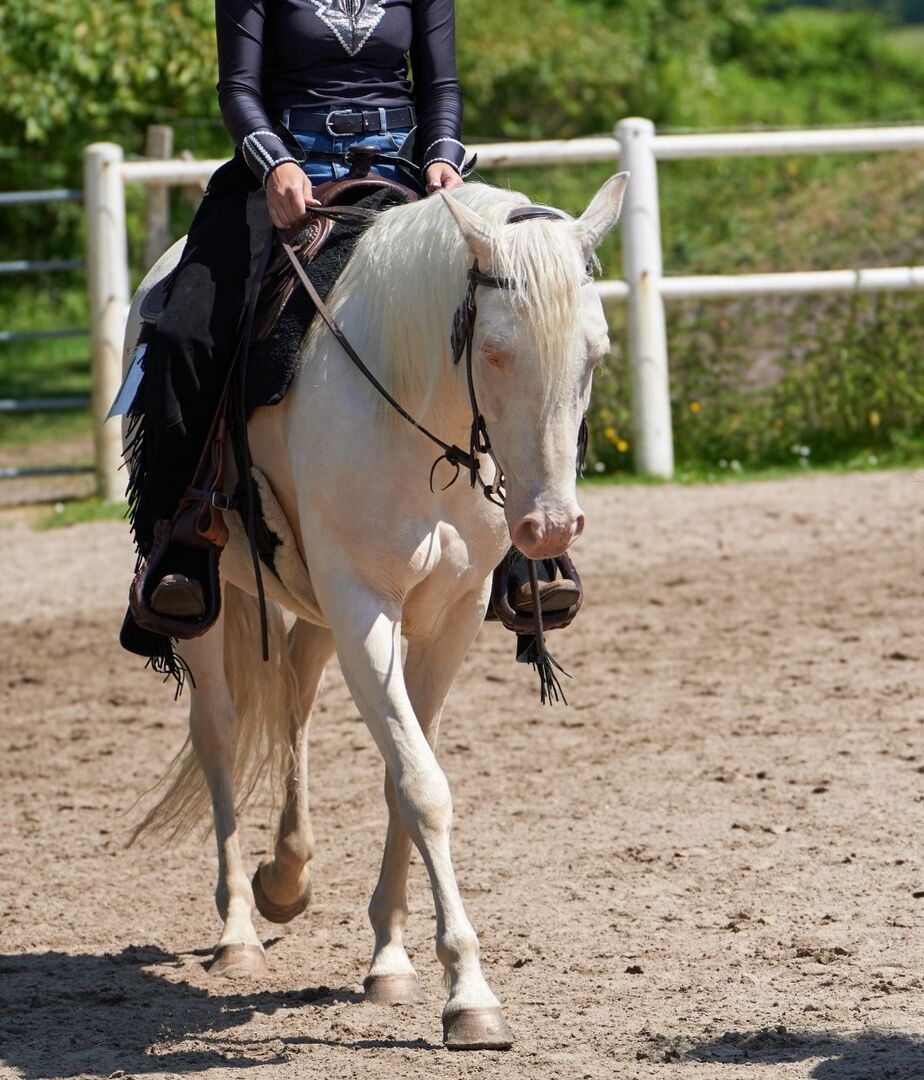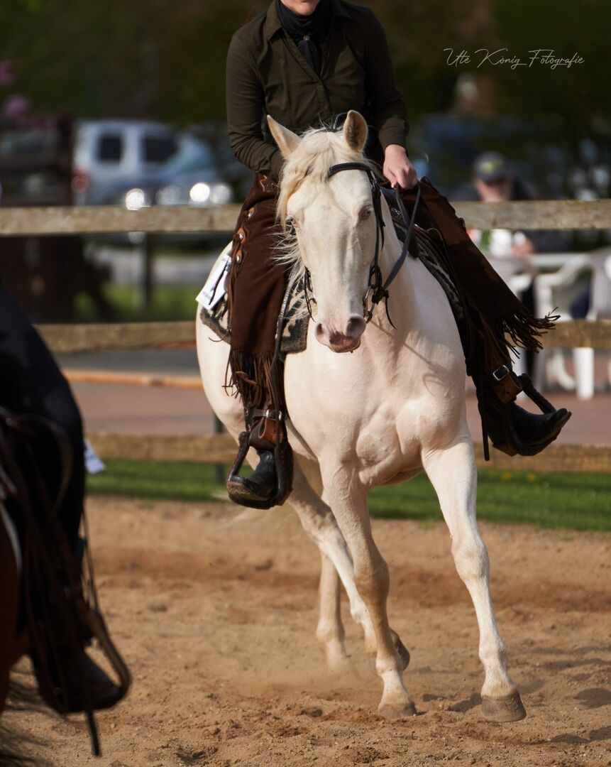 Dedykowana klacz Quarter Horse Mix w nietypowym umaszczeniu - Ta przyciągająca wzrok klacz w świetnym kolorze Perlino z szarymi oczami szuka 5-gwiazdkowego domu. Klacz urodziła się w 2016 roku i ma 146 cm wzrostu. Klacz ma prawidłową budowę i jest dobrze umięśniona. Nie jest obciążona. Rain jest obecnie trzymana w otwartej stajni, ale jest również zaznajomiona z boksami. 2 lata temu miała zwichniętą rzepkę, która była leczona w klinice. Dzięki odpowiedniemu treningowi nie sprawia jej to już żadnych problemów. Rain jest zaangażowaną i wrażliwą klaczą. Zawsze stara się zadowolić swojego jeźdźca, ale jest przeciążona, jeśli wywiera się na nią zbyt duży nacisk. Dlatego potrzebuje jeźdźca, który zapewni jej niezbędny spokój i bezpieczeństwo. Ma solidne podstawowe szkolenie westernowe i przez ostatnie 2 lata była pokazywana w jeździe na ranczu, ranczu i szlaku w EWU. Udało jej się tam zdobyć wiele miejsc. Jest również zaznajomiona z jazdą crossową. Jeździ również sama, ale woli jeździć w terenie z bezpiecznym koniem. Rain nie jest pigułką nasenną. Jest zaznajomiona z psami, dziećmi i innymi maszynami rolniczymi i nie ma z nimi problemu. Na pokazach jest wyluzowana i świetnie sobie radzi. Klacz byłaby świetnym partnerem dla spokojnego, doświadczonego jeźdźca, który chciałby spędzać z nią dużo czasu. Czy to na zawodach, czy jako towarzysz rekreacyjny. Na sprzedaż prywatnie. Lokalizacja: 49661 Cloppenburg
