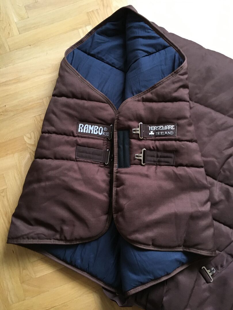 Derka dla konia 130/135 cm 400 g nowa - Nieużywana derka firmy Rambo Horseware Ireland w kolorze brązowym, z niebieską podszewką i poprzecznymi paskami, długość grzbietu 130 cm, ale jest trochę większa.