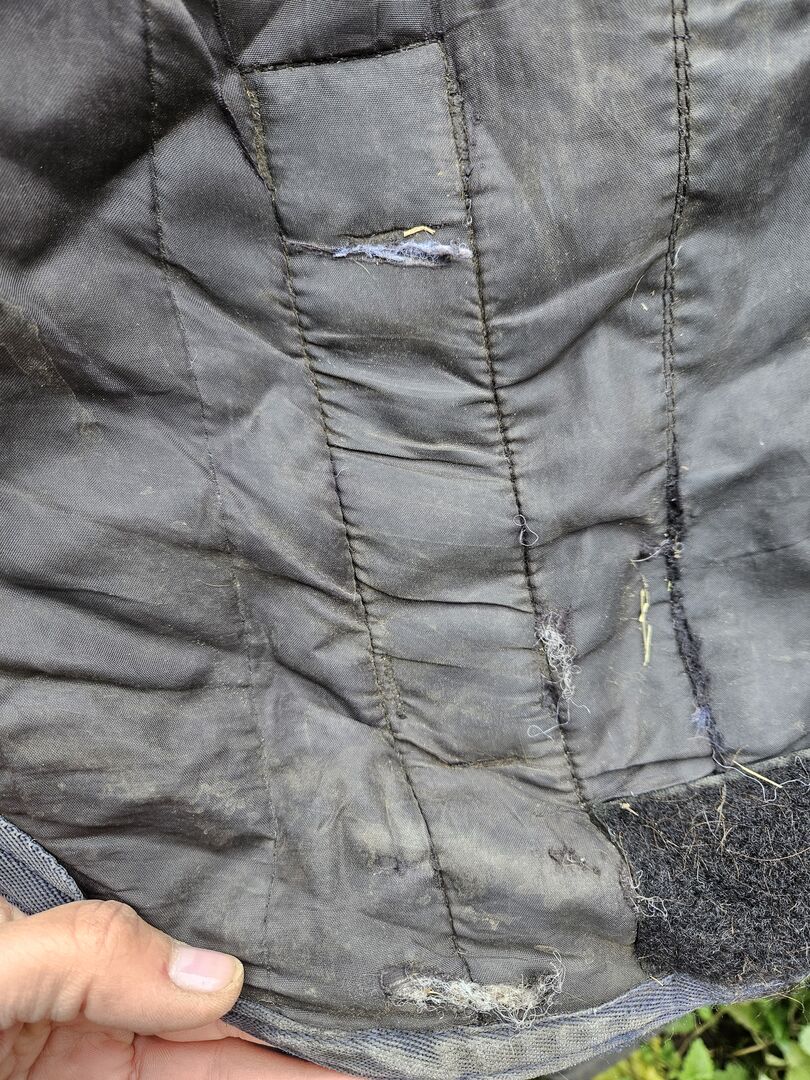 Derka dla konia, HKM, 145cm, 100g - Derka dla konia od HKM, 145cm, 100g. Wodoodporna. Niestety trochę podarta na zewnątrz, a podszewka jest trochę uszkodzona. Brakuje również klamry z przodu, która została zastąpiona karabińczykiem.