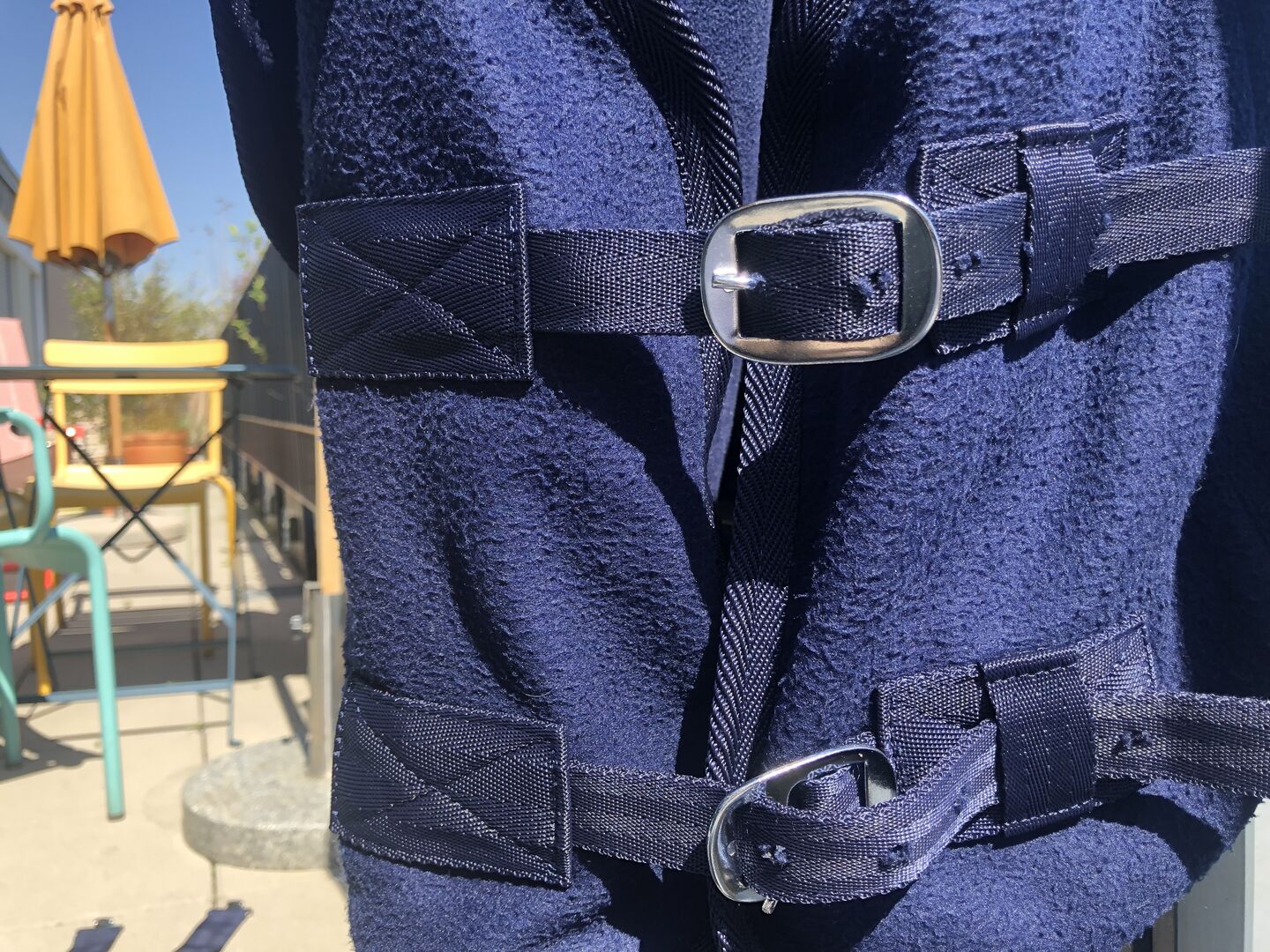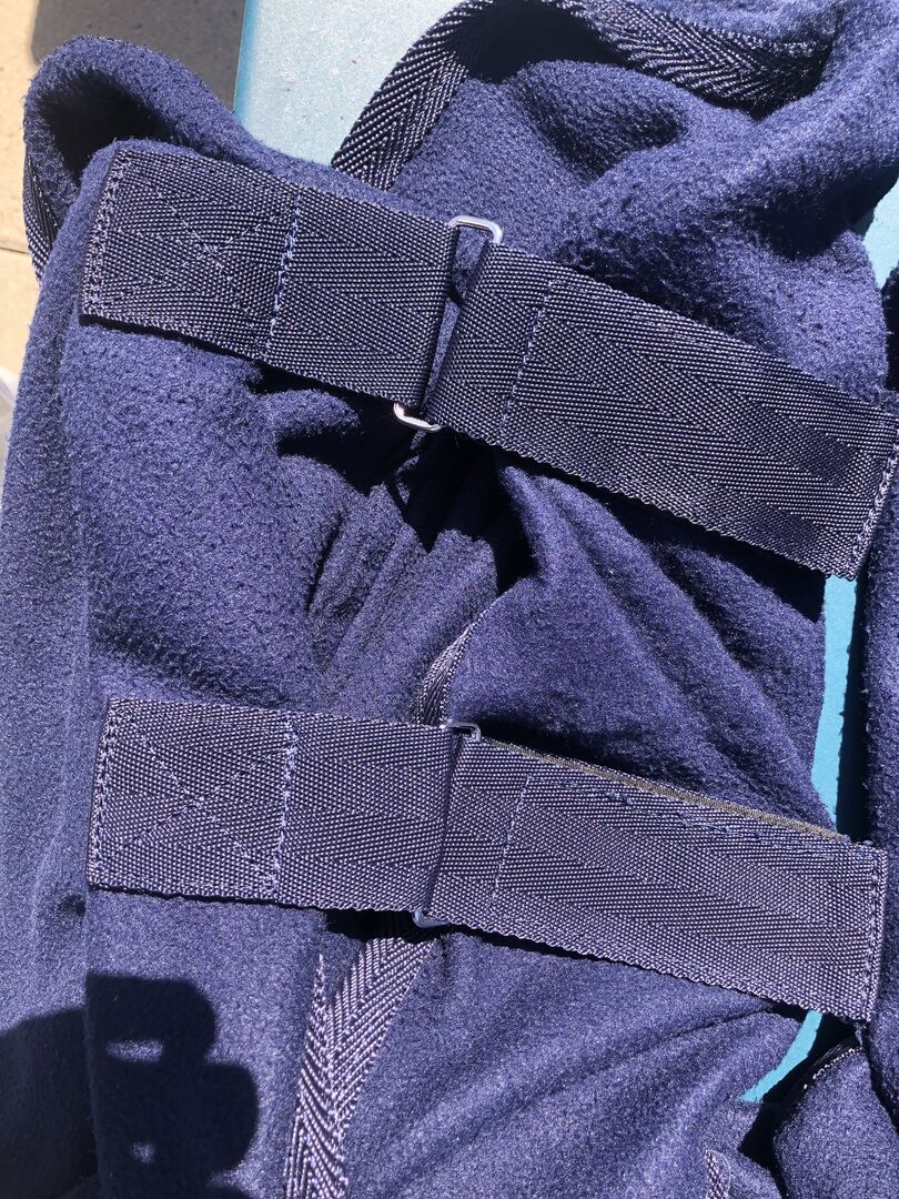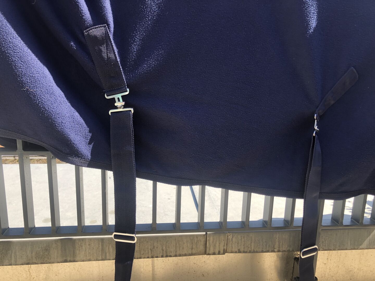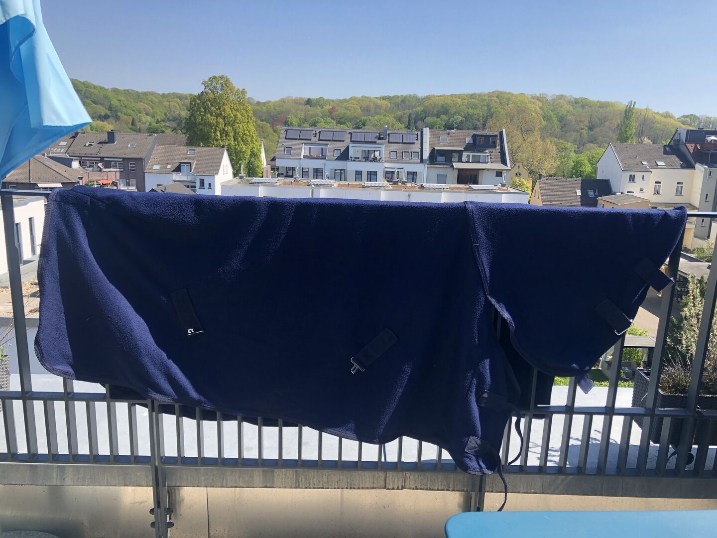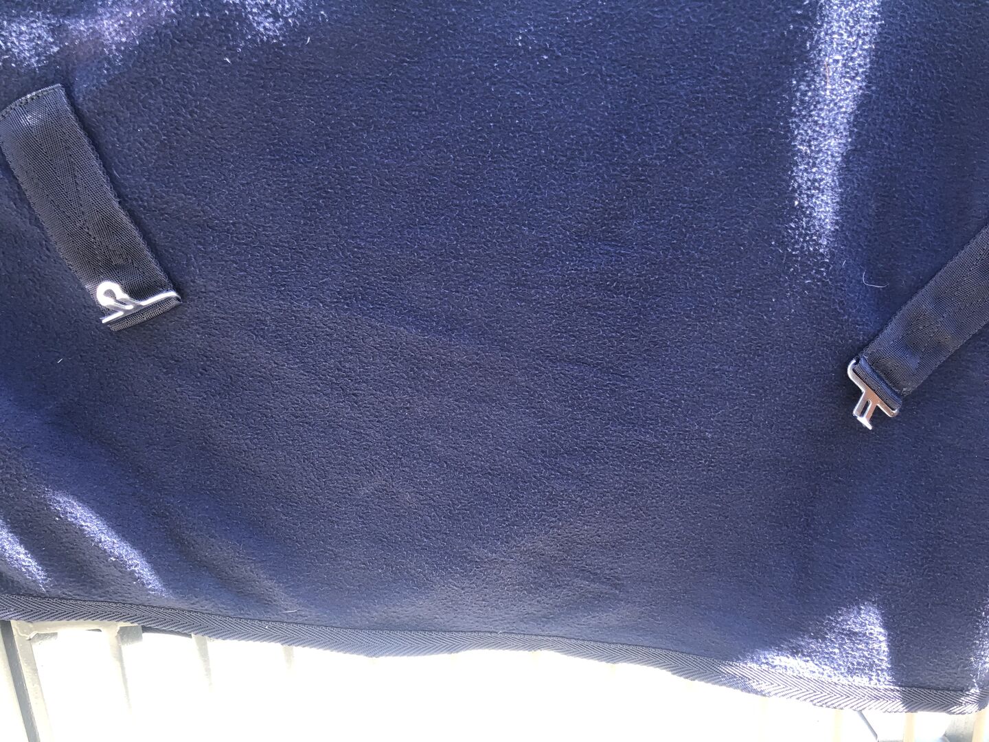 Derka potowa z kawałkiem szyi, rozmiar 115 - Derka potowa w rozmiarze 115 posiada część szyjną oraz odpinane pasy brzuszne. Bardzo dobrze wchłania pot i pomaga mocno pocącym się koniom lepiej wyschnąć w zimie. Została użyta tylko około 3 razy i jest świeżo wyprana. Oryginalna cena ok. 30€
