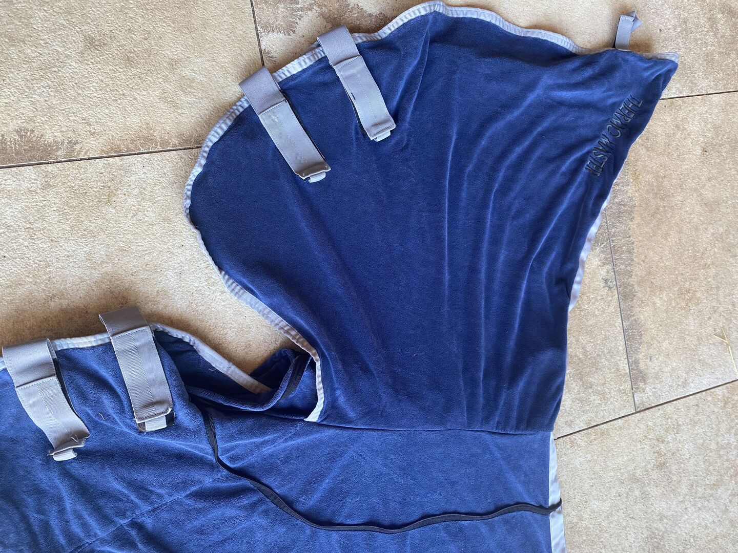 Derka przeciwpotna z kołnierzem - Dywanik przeciwpotny z częścią na szyję w kolorze średnio niebieskim w rozmiarze 135 o wyglądzie frotte. Część na szyję można schować w zamku błyskawicznym.