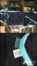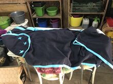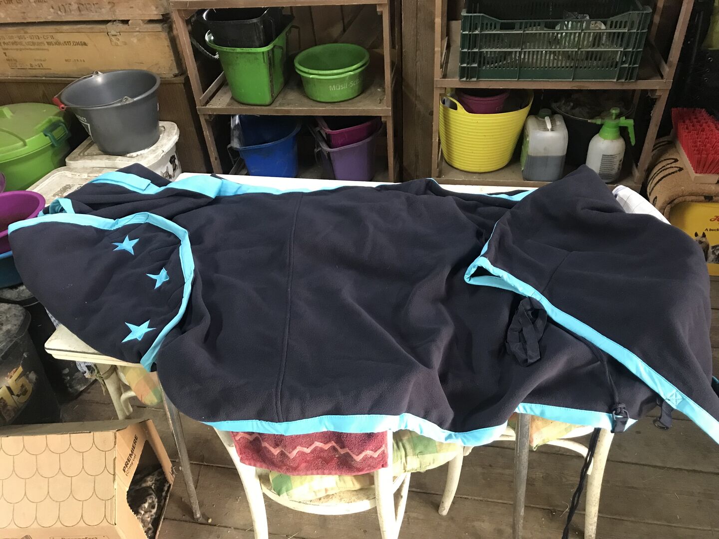 Derka przeciwpotna z kołnierzem - Sprzedam bardzo rzadko używaną derkę przeciwpotną. Część szyjna może być przymocowana do haltera za pomocą zapięcia na rzep. Kolor granatowy, długość grzbietu 1,25m Możliwa wysyłka za pobraniem lub odbiór osobisty.