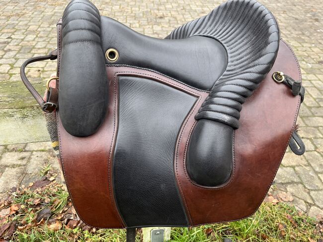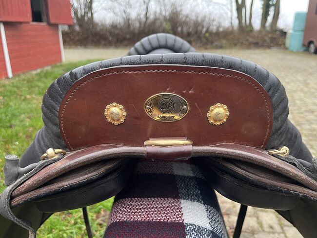 Deuber Jerez SKL S2 Bückeburg model siodła szkolnego z nowymi małymi panelami - Super wygodne i bardzo ładne barokowe siodło Deuber w modelu Hofreitschule Bückeburg z prawie nowymi, krótkimi panelami na rzepy, w kolorze czarnym/brązowym z antycznym wykończeniem i mosiężnymi okuciami. Zawiera klapę siodła, wodoodporny pokrowiec na siodło, klucz do bezstopniowej regulacji komory, barokowe strzemiona z mosiądzu, skóry mono strzemion i podkładkę pod siodło Grandeur.