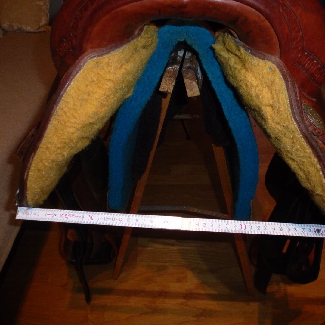 Deuber & Partner Western Saddle - Piękne siodło westernowe firmy Deuber & Partner - "Reinhold Bartmann Special TL 1330 ". ze wszystkimi papierami i paszportem siodła. Niestety muszę się rozstać z tym pięknym egzemplarzem, gdyż siodło nie pasuje już na mojego konia. Jest to siodło na zamówienie i zostało wykonane zgodnie z moimi życzeniami. Ma osiem lat i było używane tylko jako drugie siodło. Drzewo siodła posiada jeszcze dwuletnią gwarancję. Rozmiar siedziska 15,5 Siedzisko posiada dodatkową miękką wyściółkę ! To było dla mnie ważne. Błotniki są skręcone. Siodło jest absolutnie zadbane i bardzo wygodne. Sprzedaję go z ciężkim sercem. Waży ok. 13 kg - nie jest więc zbyt ciężki. Pasuje również do koni z krótkim grzbietem, ponieważ ma tylko 64 cm długości. Pierwotna cena wynosiła 2200,- euro. Na wszelkie pytania chętnie odpowiem niezwłocznie.