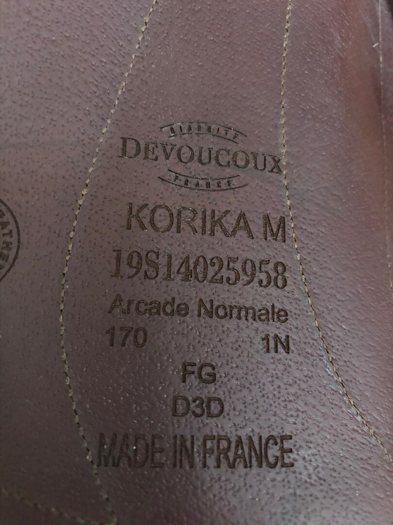 Devoucoux KORRIKA M Havana - Dobrze używane siodło ze skróconą klapą siodła i V-girthingiem. Wraz z pokrowcem i wysyłką w oryginalnym pudełku. Siodło zostało całkowicie odnowione przez producenta w 2023 roku z nowym drzewem i nowymi klapami siodła. Aktualna wyściółka 01/2024.