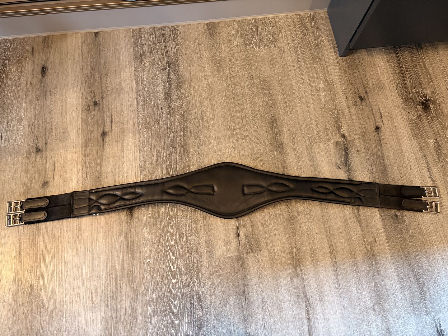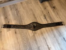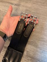 Długi popręg siodłowy Kavalkade Comfort Soft 125 Leather - Na sprzedaż zupełnie nowy popręg siodłowy marki Kavalkade. Jest to model Soft Comfort Leather. Niestety jest trochę za krótki dla mojego konia, więc muszę go ponownie zdjąć. Popręg ma bardzo ładny anatomiczny krój i jest wygodny dla konia dzięki szerokiemu napierśnikowi. Mój koń jest poza tym bardzo wrażliwy i chodził z nim bardzo dobrze. Sprzączki są elastyczne po obu stronach. Elastyczne wkładki nie są zużyte, ale nadal są ładne i ciasne. Popręg ma również różne pierścienie i karabińczyk do mocowania różnych pomocniczych lejców. Pierścienie i karabińczyk nigdy nie były przeze mnie używane i dlatego są całkowicie wolne od rdzy i nie są zmatowione. Karabińczyk działa płynnie.