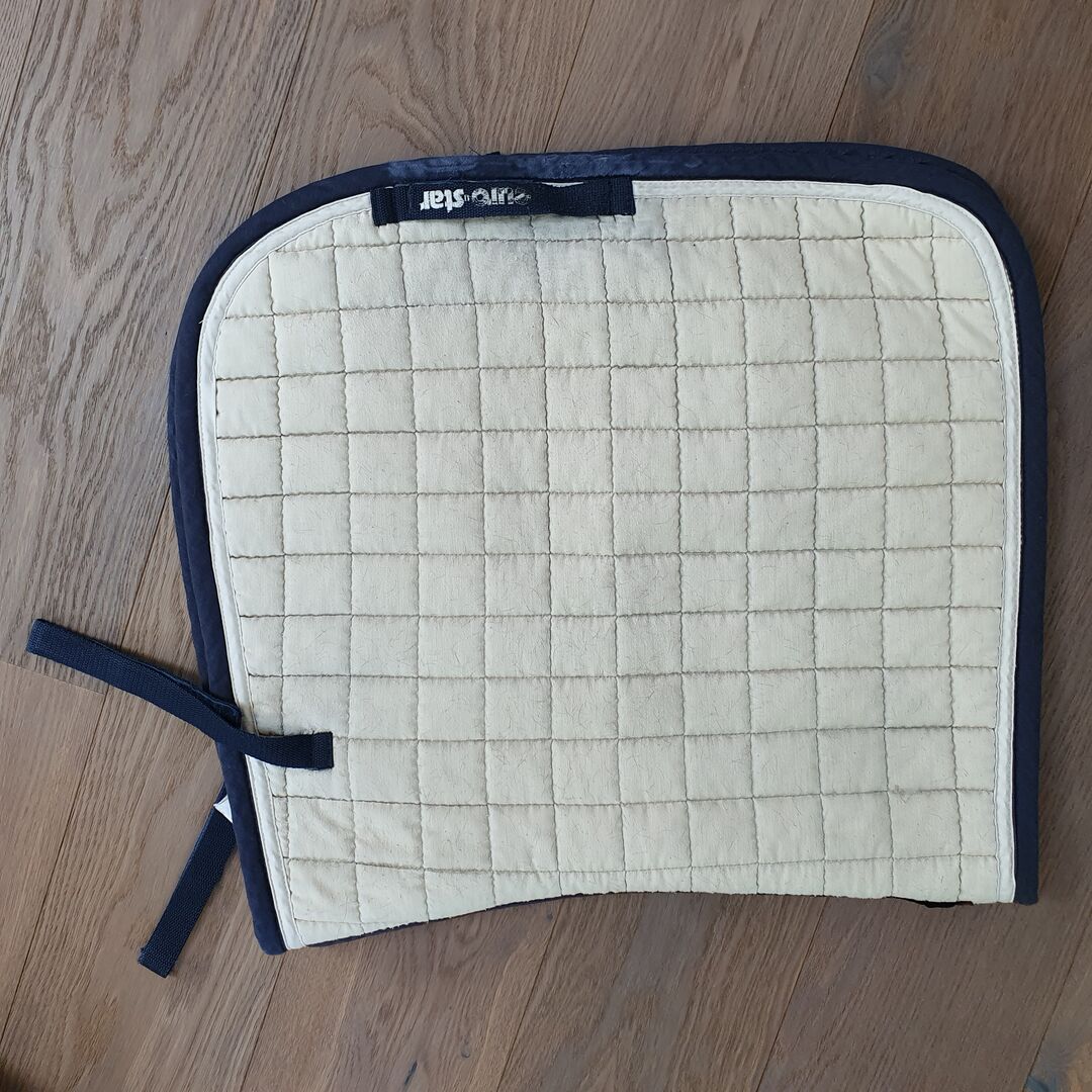DR Saddle Pad Eurostar - Kolor: jasnoszary, obramowanie: ciemnoniebieskie. Podkładka pod siodło ma zwykłe ślady użytkowania, ale poza tym jest w dobrym stanie. Sprzedaż plus koszty wysyłki.
