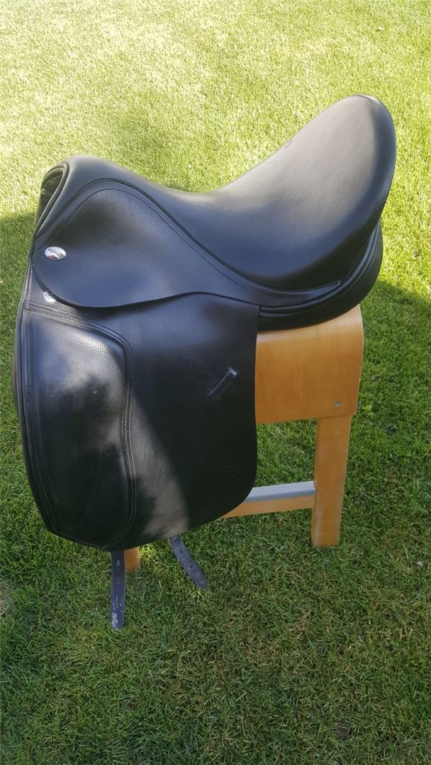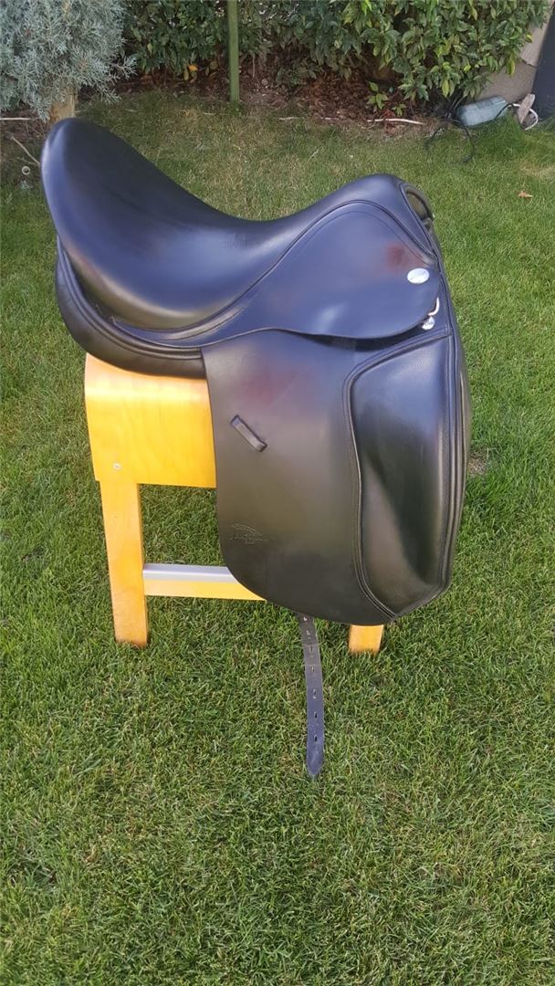 Sprzedajemy to siodło ujeżdżeniowe angielskiej marki Jaguar (dawniej Harry Dabbs). Siodło ma rozmiar 17" i krótką powierzchnię styku z podłożem dzięki francuskim panelom. Posiada również szeroki kanał grzbietowy i lekkie wygięcie. Kupiliśmy je dla naszej 140-centymetrowej klaczy jeździeckiej, ale nigdy nie regulowaliśmy siodła, ponieważ tylko skaczemy. Nie było więc używane przez ostatni rok, a szkoda, bo jest to naprawdę świetne i wygodne siodło.