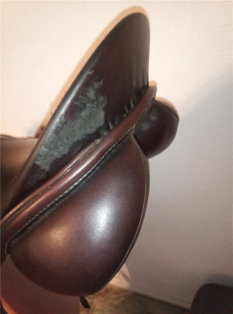 Niestety muszę sprzedać moje ukochane siodło, ponieważ mój koń stał się dla niego za szeroki. Ma siodełko w rozmiarze 1 (ja dobrze się w nim mieszczę, mając rozmiar 38) i dość krótką klapę siodła, więc nawet jeździec o krótkiej nodze może założyć łydkę na konia. Kiedyś pasował na kucyka (ten model został opracowany dla koni o krótkich grzbietach), ale bardzo dobrze pasował też na moją długą klacz pełnej krwi angielskiej. Siodło ma średnią komorę i zostało ponownie wyścielone w marcu 2019 r. oraz całkowicie sprawdzone przez rymarza. Niestety, ma małą skazę na tylnej rękojeści (patrz zdjęcie, koń się w nią wgryzł...), dlatego jest oferowany poniżej kosztów.