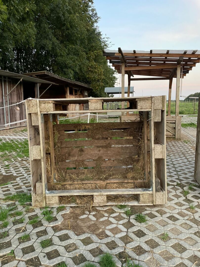 Drewniany stojak na siano - Oferuję samodzielnie wykonany stojak na siano dla koni, jak pokazano na zdjęciach. Stelaż umożliwia karmienie luźnym sianem, podłoga pośrednia zapobiega pleśnieniu siana. Nie leży bezpośrednio na ziemi. Możliwe jest również karmienie siatką na siano. Stojak na siano jest używany, ale w bardzo dobrym stanie. Rozmiar 1,20x1,20 i wysokość 80 cm. Tylko odbiór osobisty!!!!! Sprzedaż prywatna!