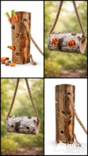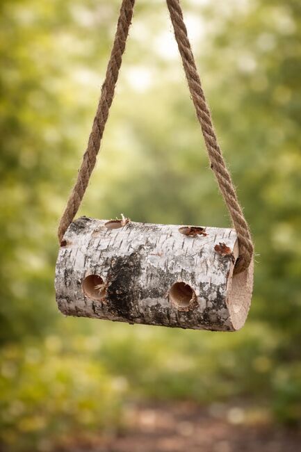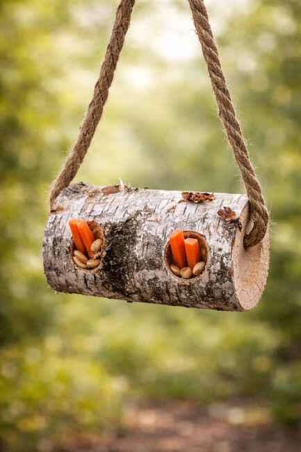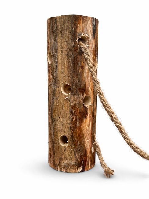 Szczegóły produktu: - Długość: ok. 30 cm (15€) - Średnica: ok. 10 cm - Z wytrzymałym zawieszeniem (naturalna lina) - Otwory z boku na smakołyki lub marchewki - Nieobrobione, naturalne drewno - Ręcznie wykonane