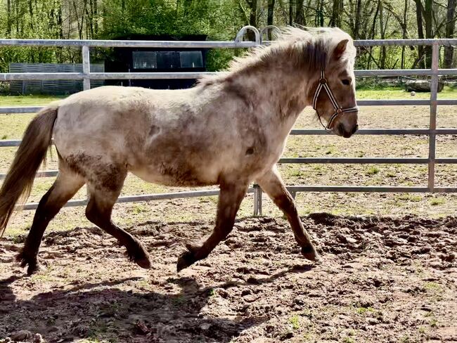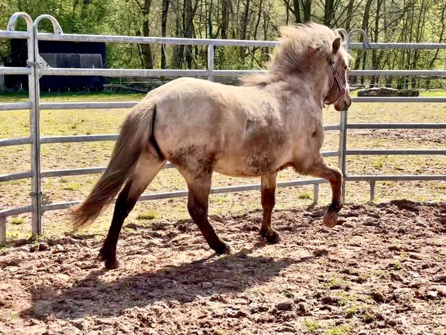 Rosa ma 3 lata i ostatecznie osiągnie wysokość około 1,40-1,45 metra. Jest solidnie zbudowana. Jej matka ma 1,43 m, a ojciec 1,41 m. Jeśli jesteś zainteresowany, możesz również obejrzeć jej matkę. Rosa jest bardzo słodką, ufną i odważną dziewczyną, zabrałem ją na spacer, gdy miała 1,5 roku. Ma regularnie werkowane kopyta, jest zaszczepiona i można ją bez problemu załadować. Uwielbia dzieci, była pielęgnowana i prowadzona odkąd skończyła rok. Ma cztery chody, nie jestem pewien co do piątego biegu, bo jeszcze go u niej nie widziałem. Jej ojciec i matka mają piąty chód. Była złotym źrebakiem na wystawie źrebiąt. Każdy, kto zna mój program hodowlany, wie, że opiekuję się moimi końmi z miłością i chcę je oddać tylko w dobre ręce. Chciałbym, aby Rosa znalazła miły dom, w którym będzie kochana. Wprowadzenie jej do domu nie będzie problemem, mogę to zrobić po wcześniejszym uzgodnieniu. Mogłaby również zostać ze mną lub w miejscu, w którym obecnie przebywa w stajni w celu dalszego wychowania.