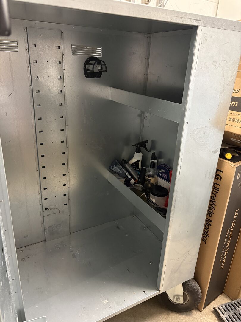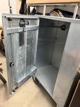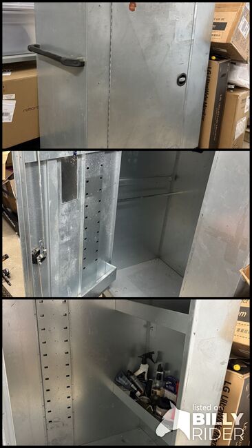 Duża przenośna szafka na haki - Duża metalowa szafka na sprzęt na kółkach. Zamykane drzwiczki z haczykami na uzdy i wieszakiem na siodło. Półki na produkty do pielęgnacji i przechowywania sprzętu. Bardzo wytrzymała i idealna do użytku na podwórku lub na zawodach. Używana, ale w dobrym stanie.