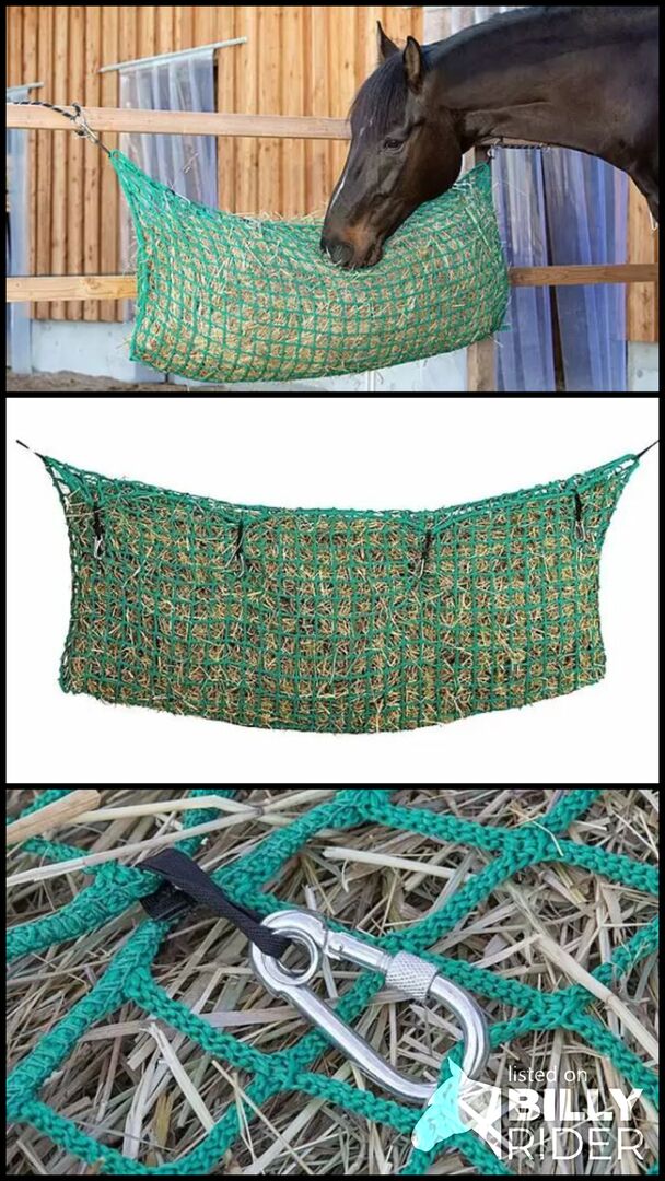 Duża siatka na siano 10 kg, łatwa do napełnienia - Tę wyjątkowo dużą siatkę na siano można łatwo napełnić od góry i zamknąć za pomocą czterech haków bezpieczeństwa. Haki są specjalnie zaprojektowane, aby zminimalizować ryzyko zranienia koni podczas jedzenia z siatki. Idealny do karmienia kilku koni w otwartych stajniach lub na padoku. Szerokość oczek 4 x 4 cm. 150 x 60 cm. Pojemność 10 kg. Z karabinkiem bezpieczeństwa. Był używany tylko przez krótki czas, ponieważ nie był już potrzebny po zmianie stajni.