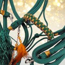Duży zestaw linek bocznych Leadrope neck ring COB - Zestaw Jade pochodzi z Freespirit Horse Art i jest wykonany ręcznie. Wspaniały zestaw w kolorach szaro-zielonym, czarnym, beżowym i złotym. Zestaw składający się z sidepulla z ozdobnym noskiem we wzorze JADE w trzech kolorach wykonanych z paracordu. Zestaw zawiera również lejce, linkę na szyję i linkę o długości 3,7 m. Wiązany kantar o grubości 6 mm. Wodze, smycz i kółko na szyję o grubości 12 mm.