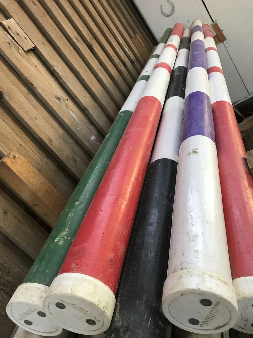 Dwanaście dwukolorowych tyczek do przeszkód - 12 tyczek do przeszkód (wielokolorowe, z kapturkami ochronnymi), tyczki z drewna krzyżowego bez rdzenia, długość 3M, średnica 10 cm. Kije były mało używane, przechowywane w pomieszczeniach zamkniętych i wykazują nieznaczne ślady użytkowania. Możliwe są również mniejsze ilości. Sprzedaję również pasujące do nich wspaniałe ocynkowane ogniowo stojaki na przeszkody. Sprzedaż prywatna, bez gwarancji, bez możliwości zwrotu.