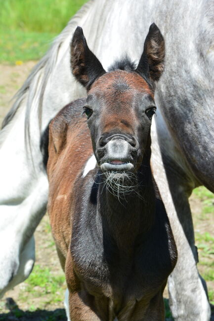 - Warmblood - Arabian - Mix - Matka Nonius Mix, ojciec ogier półkrwi arabskiej "Norcal Sierra Snoman" - Urodzony: 27.04.2023 - Harmonijna budowa, prawidłowe podłoże, ostateczny wzrost ok. 160 - Bardzo dobre kopyta, bez problemu pokonuje kamienie - Umaszczenie czarno-brązowe pinto - może być spleśniałe - Spokojny, kochający temperament, bardzo przytulaśny i zorientowany na ludzi, również bardzo zabawowy - Ma skutecznie leczoną alergię na komary (poprzez immunoterapię ASIT)