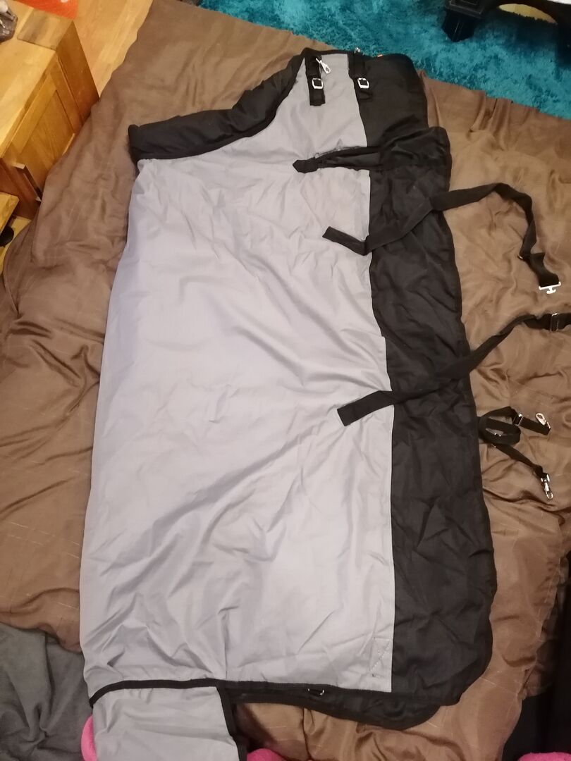 Dywan do stajni Dywan na padok - Oferuję derkę padokową/stajenną bez tylnego szwu. Rozmiar 155cm z wypełnieniem 200g. Derka posiada miękki wyściełany kołnierz, idealny dla wrażliwych koni. Derka została poddana profesjonalnemu praniu i naprawie, dzięki czemu jest gotowa do natychmiastowego użycia.