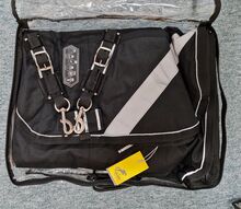 Derka zewnętrzna NEW (nieużywana, nowa cena: 229,- CHF): wyjątkowo wodoodporna, wytrzymała i szczególnie oddychająca derka przeciwdeszczowa (1,200 denier, słup wody 5,000 mm, oddychalność 4,000 g/m2/24h) z systemem wyściółki, który umożliwia przymocowanie derki za pomocą rzepów, wysokim klinem, krzyżowymi klamrami, klapą na ogon, podwójnym zapięciem z przodu z 2 karabińczykami i pierścieniem oraz dodatkowym zapięciem na rzep.
