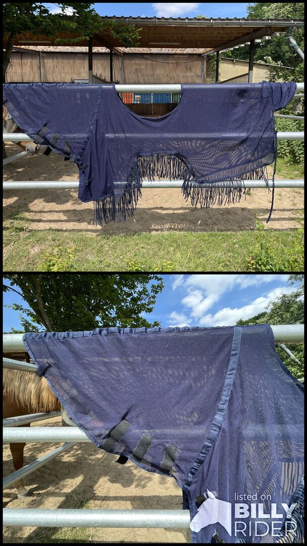 Dywanik jeździecki z frędzlami 145 - Prawie nowa, granatowa derka jeździecka z frędzlami firmy BUSSE. Koc ma część pod szyją, którą można zapiąć na rzepy lub zwinąć, jeśli szkodniki nie są tak uciążliwe. Doskonały stan, bez wad!