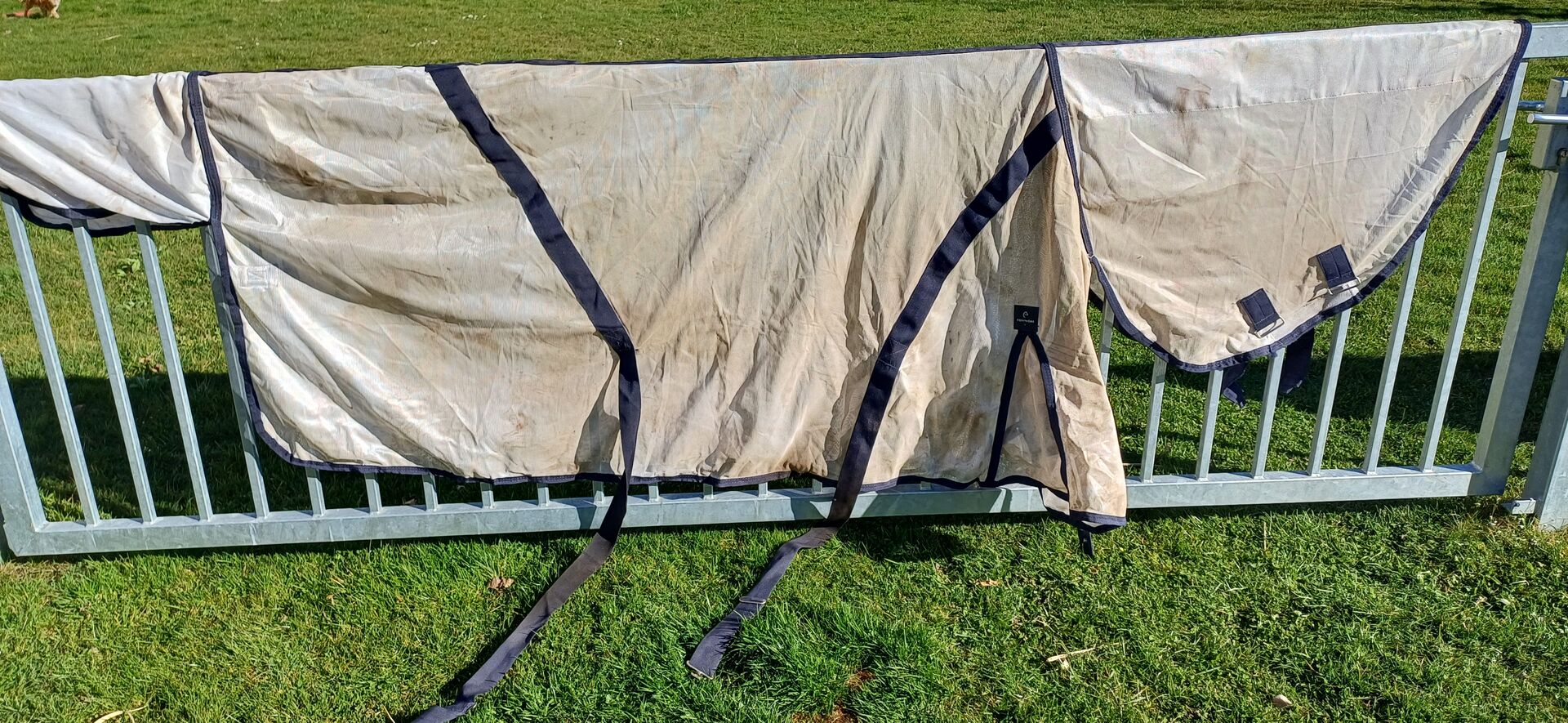 Dywanik muchowy rozmiar 165 - Dywanik kupiłam w zeszłym roku i był noszony przez mojego Norika tylko zeszłego lata. Niestety teraz już z niego wyrósł. Nie ma dziur, tylko małe otarcie spowodowane zapięciem na rzep przy szyi.