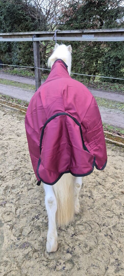 Dywanik przeciwdeszczowy 1680D highneck pony 115 125 dywanik zimowy 50g czerwone wino 5000mm - Nasza najlepiej sprzedająca się całoroczna derka przeciwdeszczowa o gramaturze 50g, często kupowana zimą, a także podczas ulewnego deszczu lub przeciągów w stajni, ze względu na głęboko osadzony śliniak przeciwpotny jest dłuższa o ok. 10 cm, obcisły, wysoki dekolt, pasuje również do koni z szeroką szyją ogiera, cena 159,90 €, artykuły targowe z rabatem 76,00 € na derki dla kucy 105, 115, 125 cm.