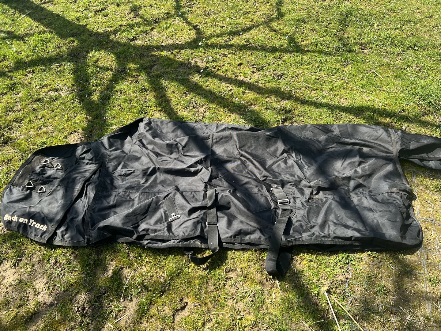 Dywanik przeciwdeszczowy Back on Track - rozmiar 165 cm - Jak nowa derka przeciwdeszczowa Back on Track w rozmiarze 165 cm. Mój koń nigdy nie nosił derki, ponieważ jest za mała. Przez kilka lat leżała w szafce pod siodłem.
