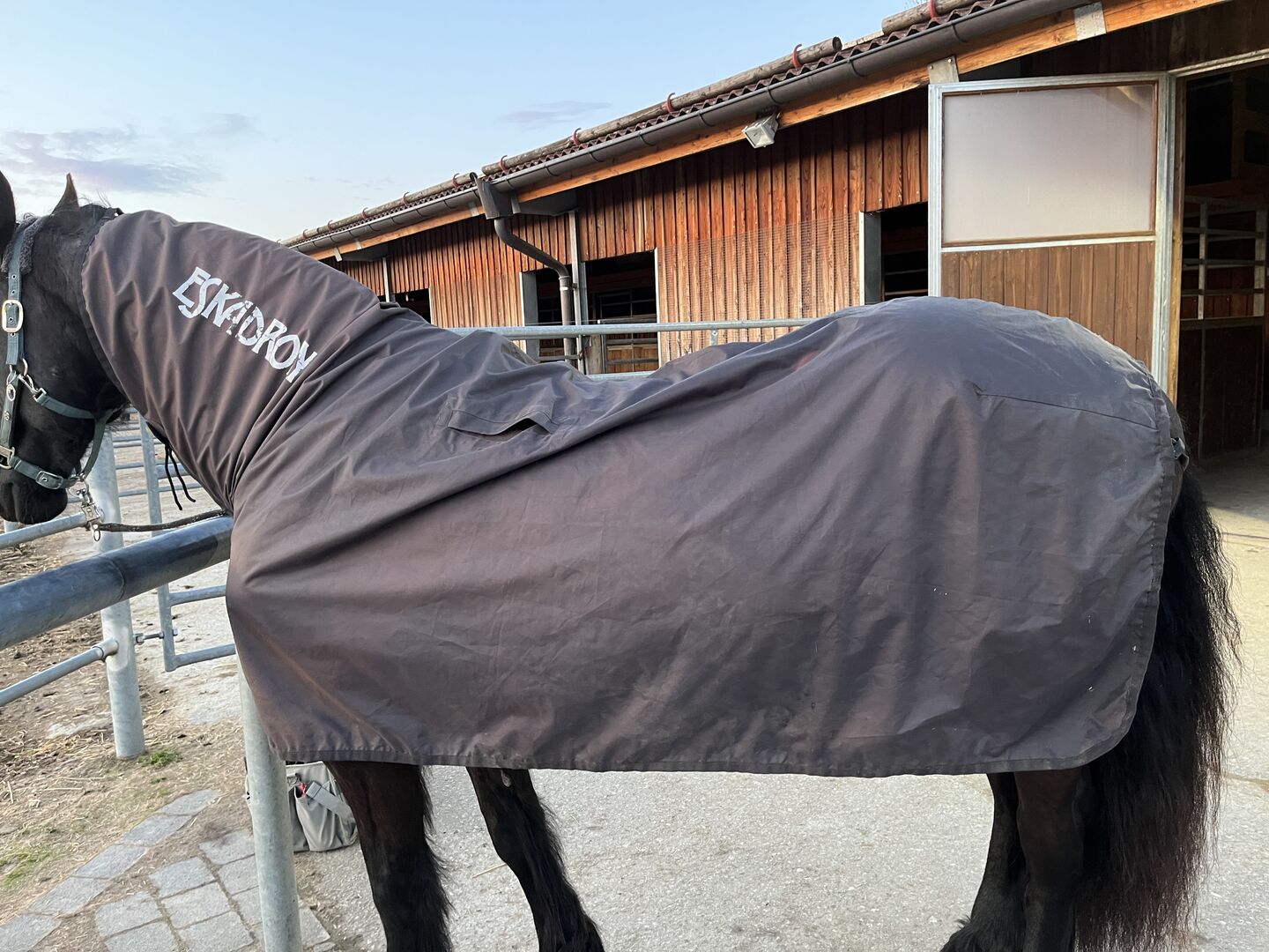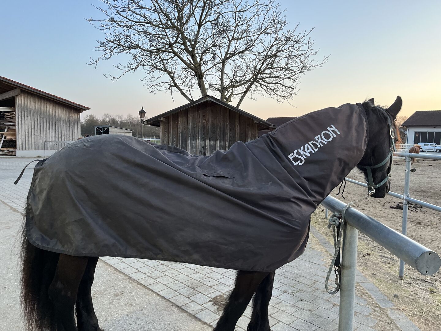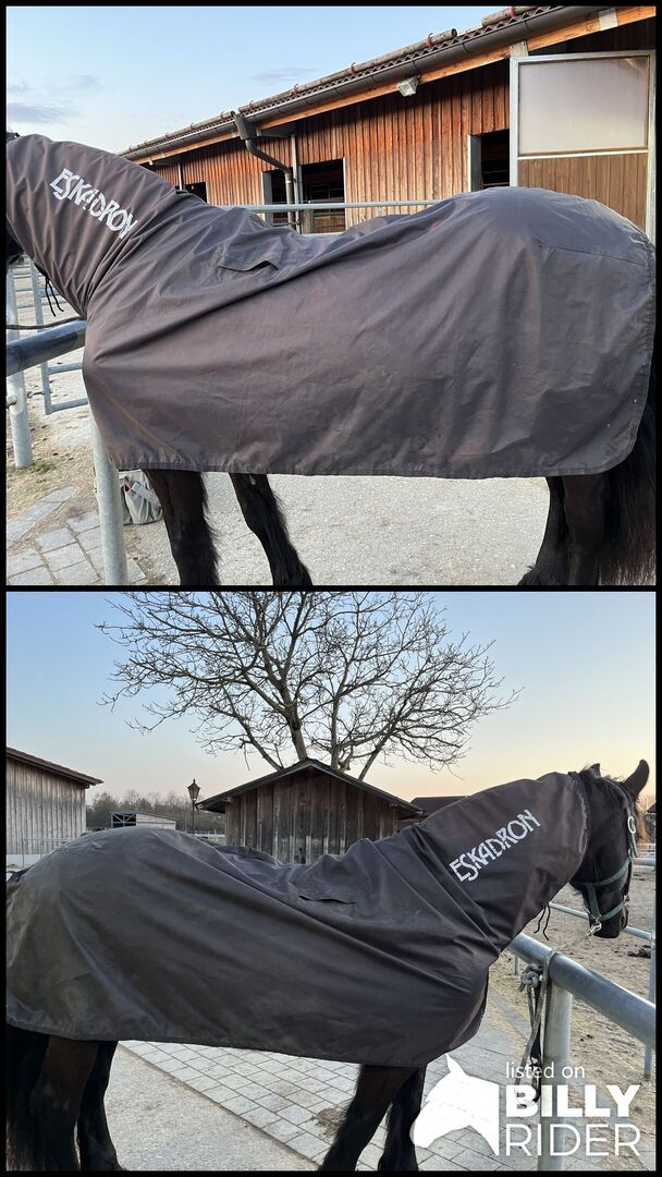 Dywanik przeciwdeszczowy Eskadron rozmiar M - Wodoodporny dywanik przeciwdeszczowy z częścią szyjną. Część szyjna zamykana jest na zamek błyskawiczny i rzepy. Derka jest bez podszewki i może być zakładana na siodło i sprzęt. Rozmiar M