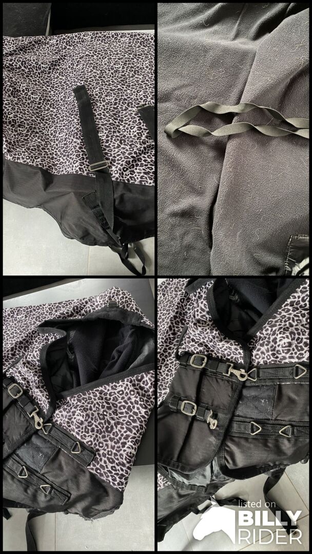 Dywanik przeciwdeszczowy/pastwiskowy 165 cm - Czarno-biały wzór Dywanik przeciwdeszczowy z klapką na ogon 165 cm Bez podszewki z lekką polarową podszewką Elastyczne sznurki na nogi i klin