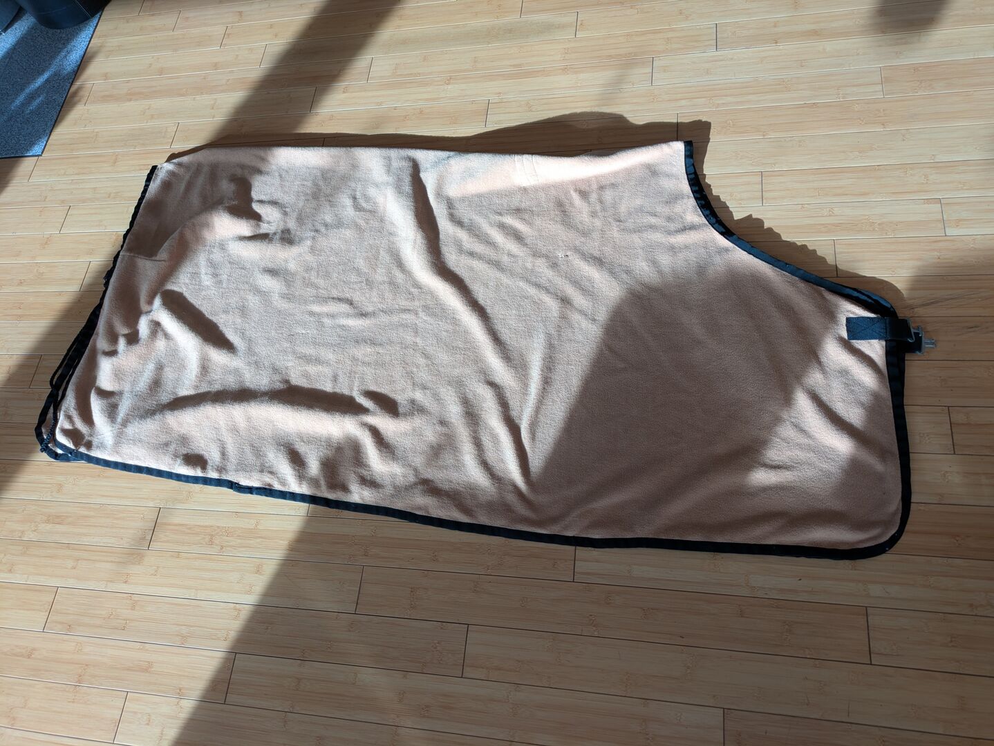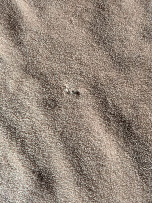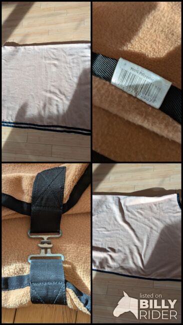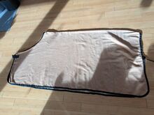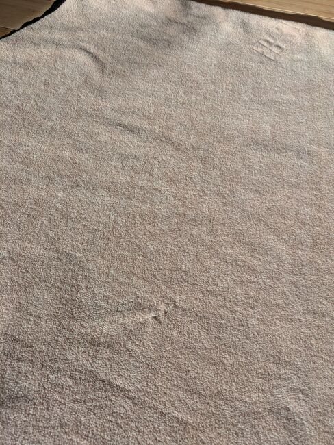 dywanik przeciwpotny beżowy 155 - Stan jak na zdjęciach. Przeszyta w 2 małych miejscach, zastanawiałam się nad naszyciem tam gwiazdek, żeby nie było ich widać, ale nie pasują na mojego konia, więc tego nie zrobiłam. Zszyte miejsca widać na zdjęciach 4 i 6 i oczywiście na dużych zdjęciach.