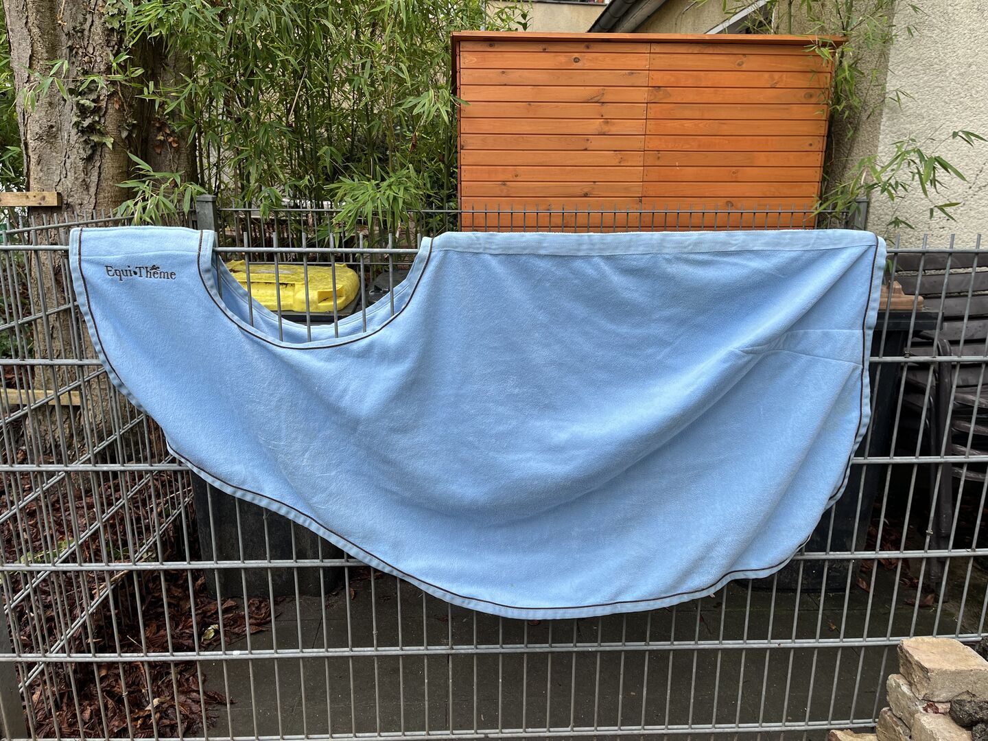 Dywanik przeciwpotny Equi-Theme z wycięciem na siodło baby blue 150 cm - Bardzo ładna dziecięca koszulka Abschwitzdecke z miękkiego, antypillingowego polaru z nitkami. Umożliwia transport ciepła z ciała dziecka na zewnątrz. Mit Klettverschluss vor dem Sattel/auf dem Widerrist. 100% poliester.