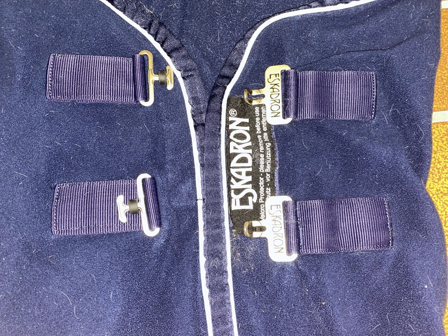 Dywanik przeciwpotny ESKADRON - Sprzedam mój dywanik Eskadron, rozmiar: 130cm. Derka nadaje się raczej dla siwego konia, ponieważ u mojego siwego konia bardzo trudno jest usunąć resztki sierści, ale i tak jest świeżo wyprana.