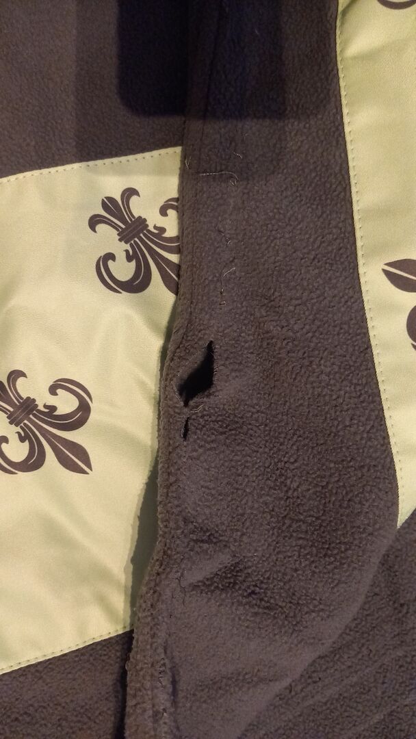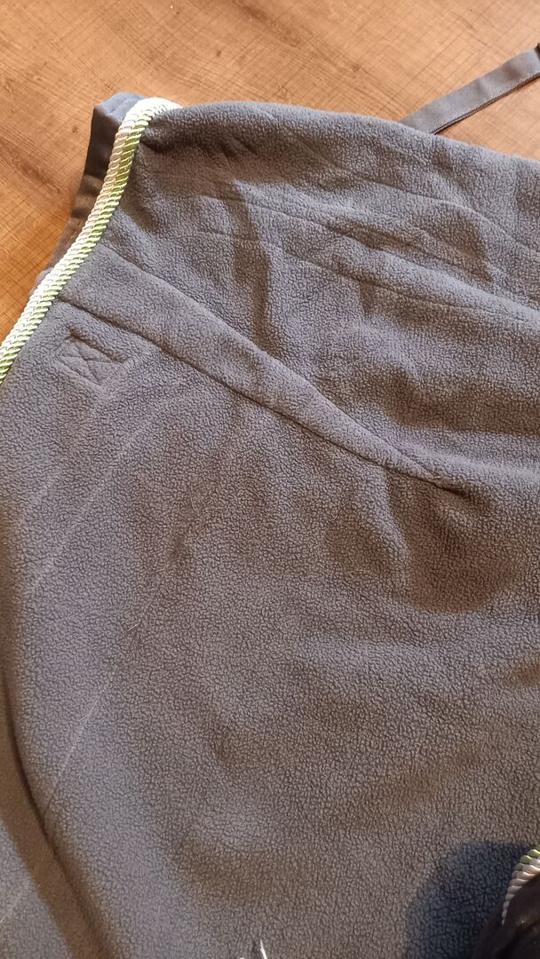 Dywanik przeciwpotny Eskadron Fleur de Lys 155 - Derka została przerobiona z rozmiaru fryzyjskiego na rozmiar haflinger. Szwy są widoczne po odszyciu, a w okolicy grzbietu są 2 małe rozdarcia. Zobacz zdjęcia.