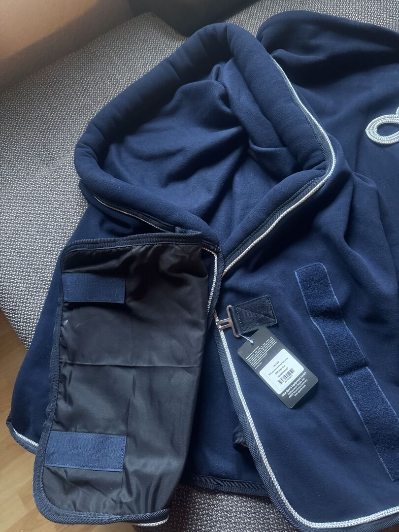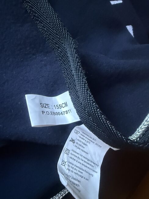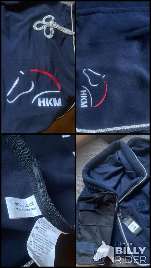 Dywanik przeciwpotny HKM z kołnierzem i śliniakiem, 155 cm - Ciemnoniebieski dres od HKM z kołnierzem i śliniakiem w rozmiarze 155 cm Jak nowy z metką Był na koniu tylko raz przez kilka minut, aby go przymierzyć.
