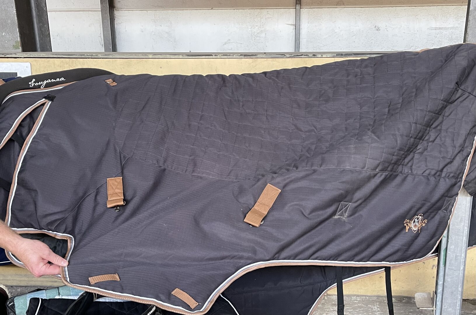 Dywanik stabilny 400g 165cm - Sprzedam (nową) bardzo ładną derkę stajenną 165cm 400g z grubym wyściełanym kołnierzem (była tylko na koniu do przymiarki).