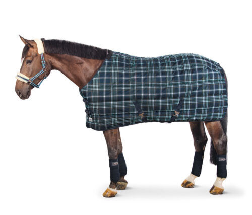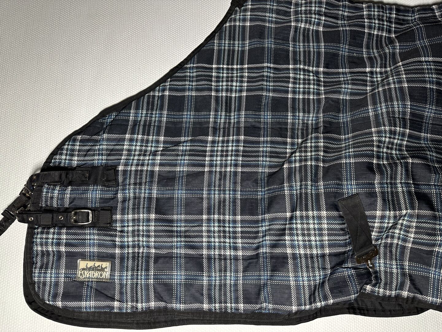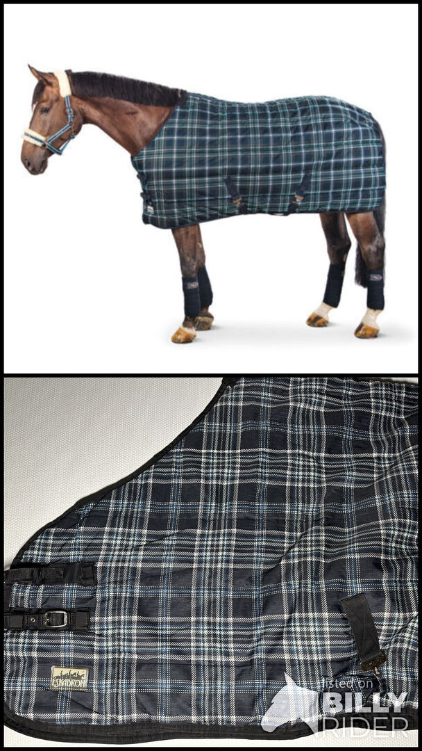 Dywanik stajenny Eskadron w kratkę 150g 165cm - używany stabilny dywan, górna klamra na piersi jest uszkodzona, ale dywan jest w pełni funkcjonalny, świeżo wyprany w pralni chemicznej, więcej zdjęć na życzenie
